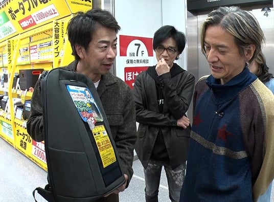 まずはヨドバシ梅田マルチメディア館へ。防災グッズを買いたいという岡本はさまざまな防災グッズに興味津々。まるで定員かのようなやすよの説明に、思わずツッコミを入れる場面も…