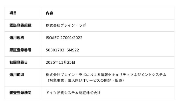 人材紹介・人材派遣業界向けに業務管理システムおよびDX支援ツールを提供する株式会社ブレイン・ラボ(本社:東京都港区、代表取締役社長:中江典博、以下 ブレイン・ラボ)は、情報セキュリティマネジメントシステム(ISMS)の国際規格である「ISO/IEC 27001:2022」の認証を取得いたしました。