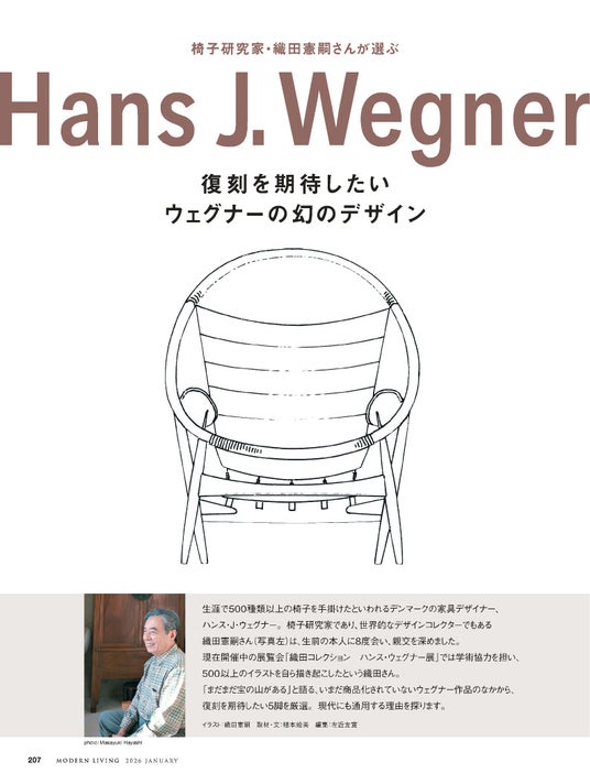 椅子研究家・織田憲嗣さんが選ぶ 復刻を期待したいウェグナーの幻のデザイン生涯で500種類以上の椅子を手掛けたといわれるデンマークの家具デザイナー、ハンス・J・ウェグナー。椅子研究家であり、世界的なデザインコレクターでもある織田憲嗣さんは、生前の本人に8度会い、親交を深めました。