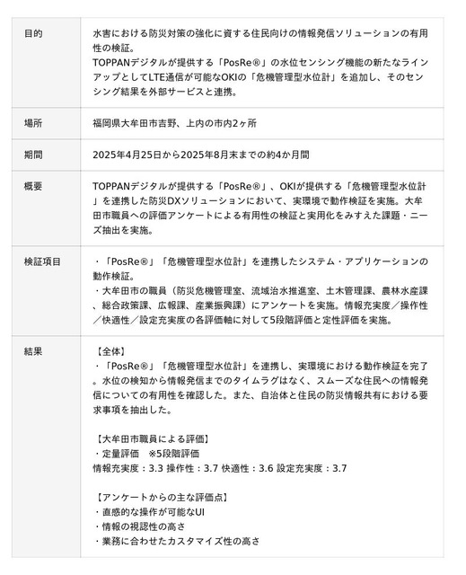 OKIは、TOPPANデジタル株式会社(本社:東京都文京区、代表取締役社長:坂井 和則、以下 TOPPANデジタル)と、豪雨による水害時の迅速な情報発信を目的に、河川水位の自動検知と住民向けの情報発信を連携した防災DXソリューション(以下、本ソリューション)の実証実験を、福岡県大牟田市(市長:関 好孝、以下 大牟田市)の協力のもと、2025年4月25日から8月末までの約4カ月間、大牟田市吉野、上内の市内2ヶ所で実施しました。本実証後、大牟田市職員への評価アンケートなどを実施し、本ソリューションの有用性を確認しました。