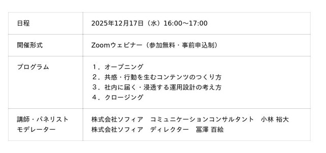 本セミナーでは、社員の共感・行動を引き出す“体験設計”と、継続的に届け浸透させていく“運用設計”の視点から、「伝わるだけで終わらせない」コンテンツの考え方と工夫を、実例を交えながらご紹介します。
