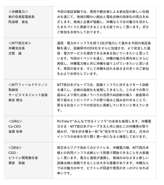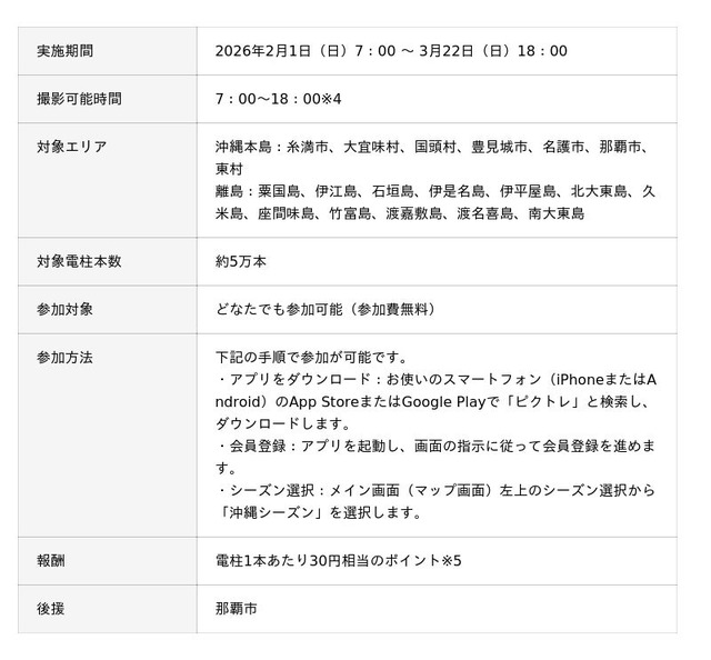 NTT西日本株式会社 (本社:大阪府大阪市、代表取締役社長:北村 亮太、以下「NTT西日本」)、株式会社NTTフィールドテクノ(本社:大阪府大阪市、代表取締役社長:桂 一詞、以下「NTTフィールドテクノ」)、沖縄電力株式会社(本社:沖縄県浦添市、代表取締役社長:本永 浩之、以下「沖縄電力」)は、Digital Entertainment Asset Pte. Ltd.(本社:シンガポール、Founder & CEO:吉田 直人、Founder & Co-CEO:山田 耕三、以下「DEA」)が開発し、Growth Ring Grid Pte. Ltd.(本社:シンガポール、CEO:福田 史、Co-CEO:鬼頭 和希、以下「GRG」)が運営する市民参加型社会貢献ゲーム「PicTree(ピクトレ)」※1を活用した市民参加イベント「ぼくとわたしの電柱合戦in沖縄」を2026年2月1日(日)から3月22日(日)の約2ヶ月間開催し、共同点検※2に向けた実証実験を行います。