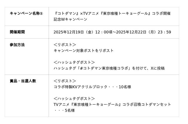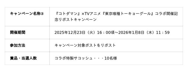 さらに、本日12月19日(金)よりコラボ記念スペシャルPVを公開します。そのほか、『コトダマン』×TVアニメ『東京喰種トーキョーグール』コラボ召喚コトダマンセットや「コラボ特製サコッシュ」などが抽選で当たるXキャンペーンを開催します。