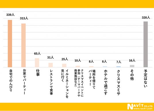 クリスマスの予定についてのアンケートも複数回答にていただきました。最も多かったのが「自宅でのんびり」で339人、そして「お家でパーティー」が313人と、自宅で過ごす人が多いことが分かる結果となりました。