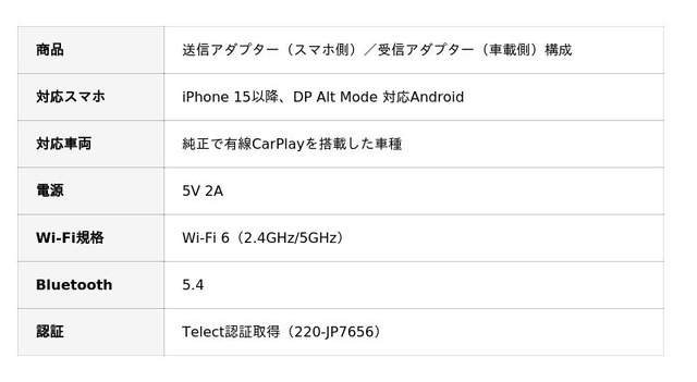 本製品は、市場で増え続ける「車内でスマホ画面をそのまま映したい」というニーズに応えるために開発されたシリーズ唯一のワイヤレス投屏特化モデルです。iPhone 15以降およびDisplayPort Alt Mode対応Androidスマホに対応し、純正で有線CarPlayを搭載した車両でご利用いただけます。