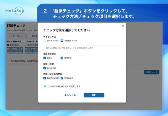 2.「翻訳チェック」ボタンをクリックして、チェック方法/チェック項目を選択します。