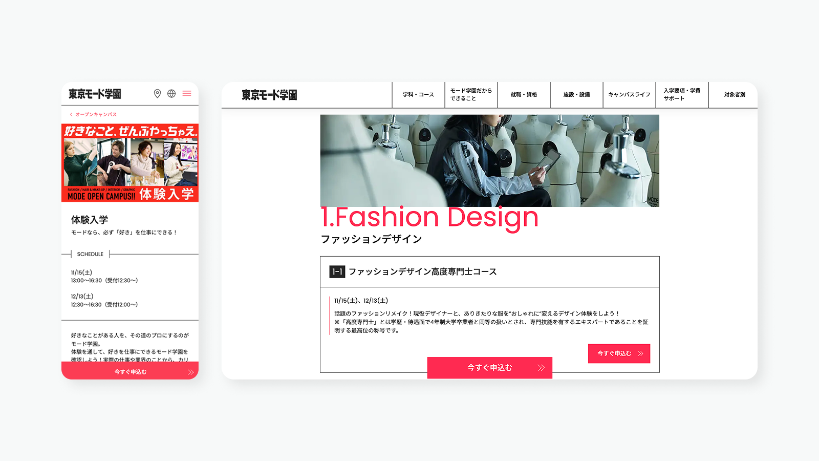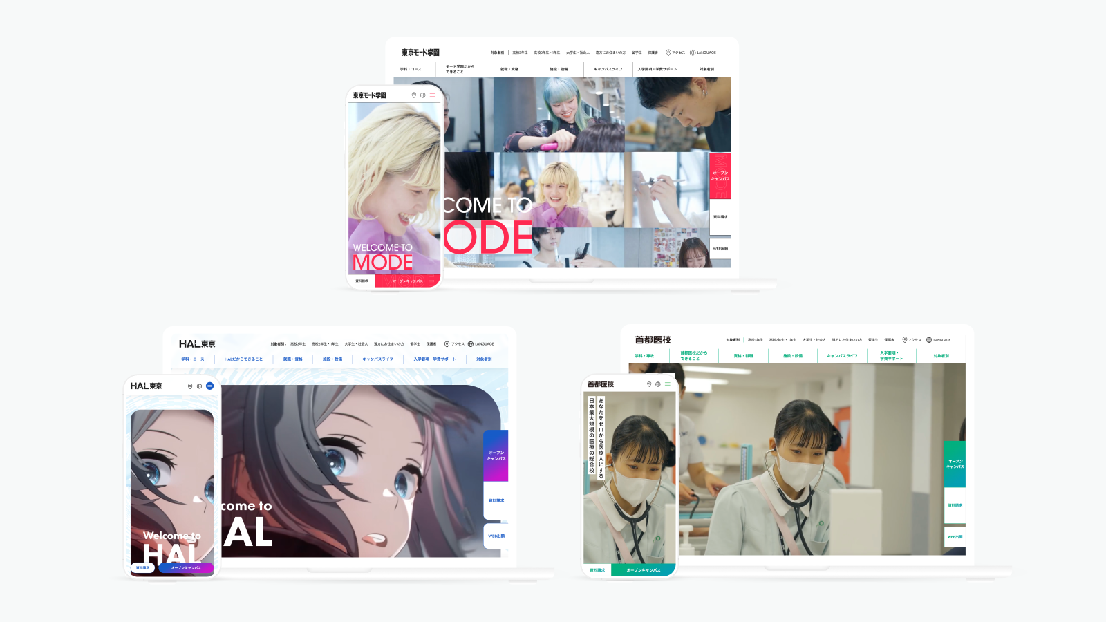 本リニューアルでは、各校のブランドイメージ確立と、資料請求、オープンキャンパス参加の促進を主眼に置き、ウェブサイトの全面的な刷新を実施いたしました。