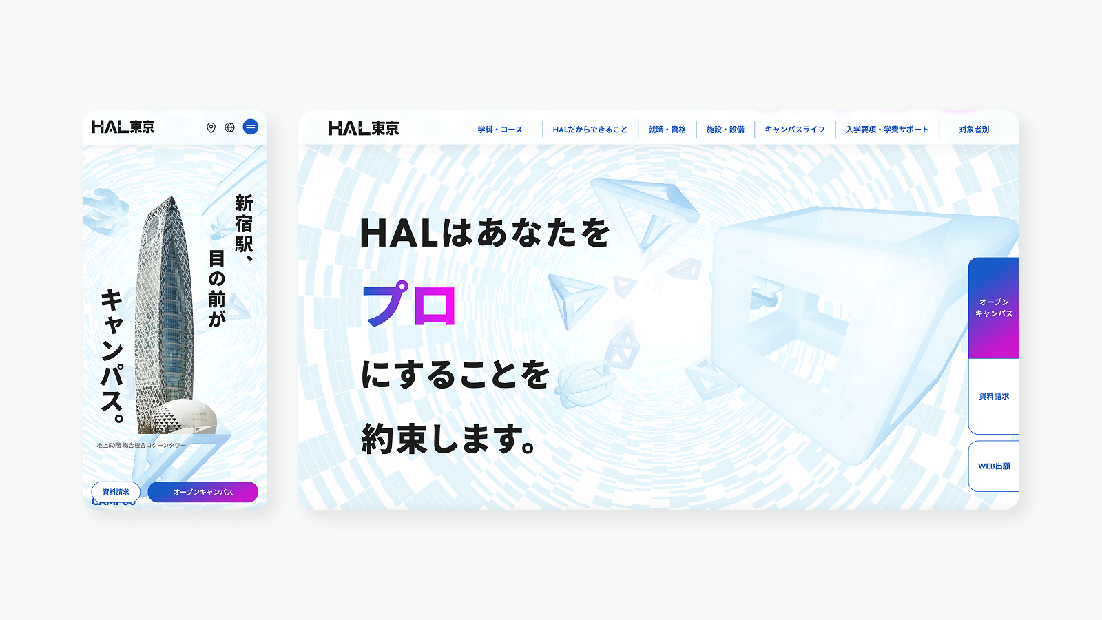 各校のトップページには、スクロール連動型のアニメーション演出を導入し、ブランドイメージを強化しました。中でも、HALのトップページには、革新性を表現する要素として、インタラクティブな3Dアニメーションを実装しました。