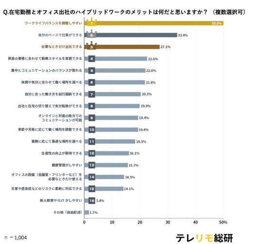 今回の調査では、ハイブリッドワークのメリットとして、「ワークライフバランスを調整しやすい(50.0%)」や「自分のペースで仕事ができる(33.4%)」といった、生活や働き方の柔軟性に関する項目が上位を占めることがわかりました。