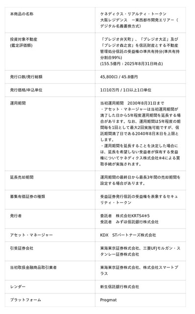 ケネディクス株式会社(代表取締役社長COO:寺本 光、以下「ケネディクス」)、みずほ信託銀行株式会社(取締役社長:笹田 賢一、以下「みずほ信託銀行」)、東海東京証券株式会社(代表取締役社長:北川 尚子、以下「東海東京証券」)、三菱UFJモルガン・スタンレー証券株式会社(取締役社長:小林 真、以下「三菱UFJモルガン・スタンレー証券」)及び株式会社スマートプラス(代表取締役:小林 紀子、以下「スマートプラス」)は、デジタルアセット発行・管理基盤「Progmat※1」(プログマ)を活用した、不動産セキュリティ・トークン※2(以下「本ST」)の公募に関して協業し、この度、募集・発行が完了いたしました。