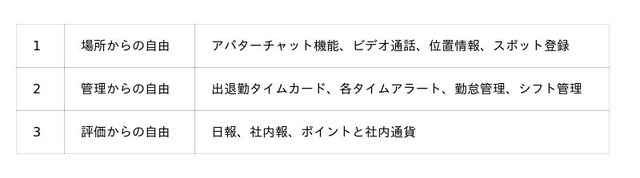 私たちは、現代社会が抱える3つの不自由(場所、管理、評価)を解消し、社員をストレスから解放することで、イノベーションを起こす企業が誕生する空間を実現していきたいと考えています。