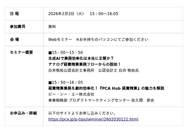 2026年2月3日には「公認会計士YouTuberくろいちゃんねる」を運営する公認会計士 白井 敬祐氏をゲストに迎え、生成AIを活用し最も賢く、安全に業務フローを整えるための「最適解(真の経理DX)」について、PCA主催のWebセミナーを開催いたします。セミナー後半では『PCA Hub 経費精算』の詳細機能や、交通系ICカード連携についても詳しくご紹介します。ぜひご参加ください。