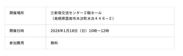 公益財団法人うんなんコミュニティ財団(本社:島根県雲南市木次町木次36 代表理事:郷原剛志)及びたすき株式会社(本社:島根県雲南市木次町木次8−6 代表取締役社長:岡 晴信)は、第3回木次本通り地区エリアプラットフォーム「ふらっと木次」設立準備会を2026年1月18日(日)10時~12時に開催します。この準備会では、木次駅前・本通りエリアの将来を担う関係者の皆様と、木次駅前・本通りの街の将来像(エリビジョン)について、ワークショップ形式で意見交換を実施します。