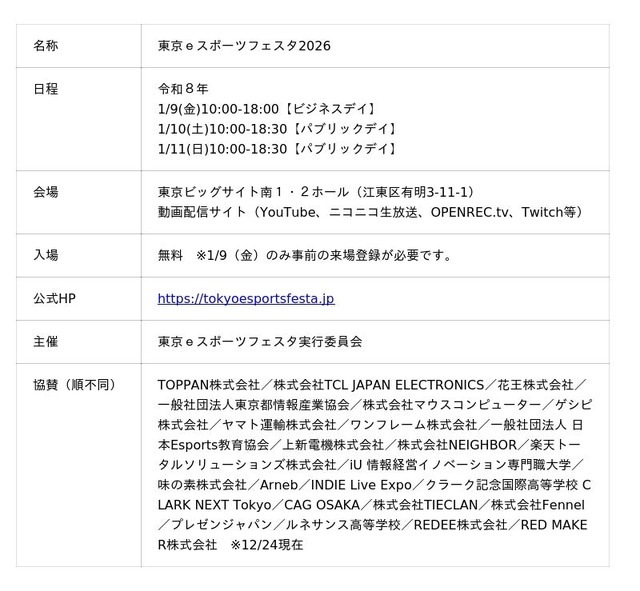 この度、都内中小企業やインディーゲームクリエイター、学生等を対象とした対戦型ゲーム開発コンテスト「Tokyo esports Game Development Contest 2026」プロ部門のファイナリスト・特別賞受賞作品及び学生部門の入賞作品が決定しましたので、お知らせします。フェスタでは、来場者が各作品を体験できるブースを設けるほか、ファイナリスト及び各賞受賞者によるプレゼンテーションを実施します。また、1月9日及び10日にファイナリスト作品を対象とした来場者投票を行い、11日の表彰式にて大賞・優秀賞を発表します。ぜひ会場へお越しください。