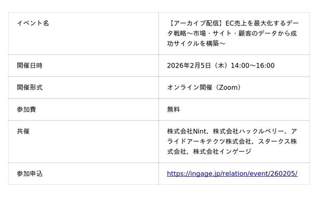 顧客対応クラウド「Re:lation(リレーション)」を提供し、6,000社以上(※1)の導入実績を誇る株式会社インゲージ(本社:大阪府大阪市、代表取締役:和田 哲也、以下インゲージ)は、2026年2月5日(木)に、EC事業の売上最大化を実現するためのデータ戦略をテーマとしたウェビナー「EC売上を最大化するデータ戦略~市場・サイト・顧客のデータから成功サイクルを構築~」をアーカイブ配信いたします。競争激化するEC市場において、市場分析から顧客体験(CX)向上まで、成長サイクルを構成する5つの重要領域における最新のデータ活用戦略と具体的なノウハウを、各分野のリーディングカンパニーが結集し解説します。