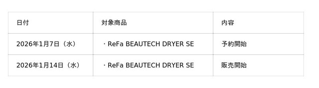 株式会社MTG(本社:愛知県名古屋市、代表取締役社長:松下剛)の美容ブランド『ReFa(リファ)』は、2025年10月から一部市場にて先行販売している「ReFa BEAUTECH DRYER SE(リファビューテック ドライヤー SE)」の全国のReFa SHOP(百貨店・ReFa表参道ヒルズ・GINZA SIXを除く)※1での予約を2026年1月7日(水)に、販売を1月14日(水)に開始いたします。また、家電量販店※2・MTG公式オンラインショップでも取り扱いを開始いたします。