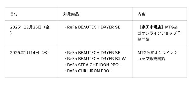 さらに、同じく2025年10月から11月にかけて一部市場にて先行発売した「ReFa BEAUTECH DRYER BX W(リファビューテック ドライヤー BX W)」、「ReFa STRAIGHT IRON PRO+(リファストレートアイロン プロ+)」、「ReFa CURL IRON PRO+(リファカールアイロン プロ+)」のMTG公式オンラインショップでの取り扱いを1月14日(水)に開始いたします。