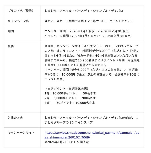 本キャンペーンの参加にはエントリーが必要で、期間中にエントリー※1の上、しまむらグループの店舗・オンラインストアで期間中合計3,000円(税込)以上「d払い(R)」※2※3※4または「dカード(R)」※5※6でお支払いいただいたお客さまの中から、抽選でdポイント(期間・用途限定)最大10,000ポイントを進呈いたします※7。詳細はキャンペーンサイトをご確認ください。