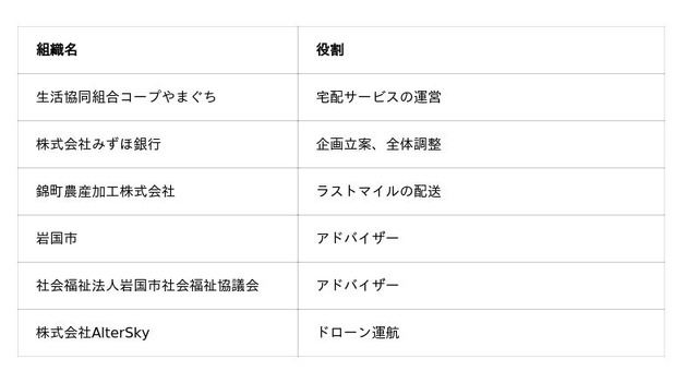 山口県は、その地理的特性から、多くの中山間地域や島嶼地域を抱え、高齢化と過疎化が深刻な問題となっています。県内の食品等流通は、1.人口減少・高齢化による食品等の需要変化への対応、2.食品等流通コストの増加、3.災害時の物流網維持の困難さといった課題に直面しており、デジタル技術の活用による配送効率化により、住民の移動コストと物流コストの双方を抑える抜本的な仕組みの構築が求められている状況にあります。そこで、山口県全域で宅配事業を展開するコープやまぐちが、道の駅「ピュアラインにしき」を運営する錦町農産加工と組み、岩国市や社協、当社と連携する体制により、道の駅や公民館等の拠点、ドローン配送等の物流効率化技術を活用することで、地域住民の食品・日用品・医薬品等のアクセスを改善し、流通量の増加を目指します。