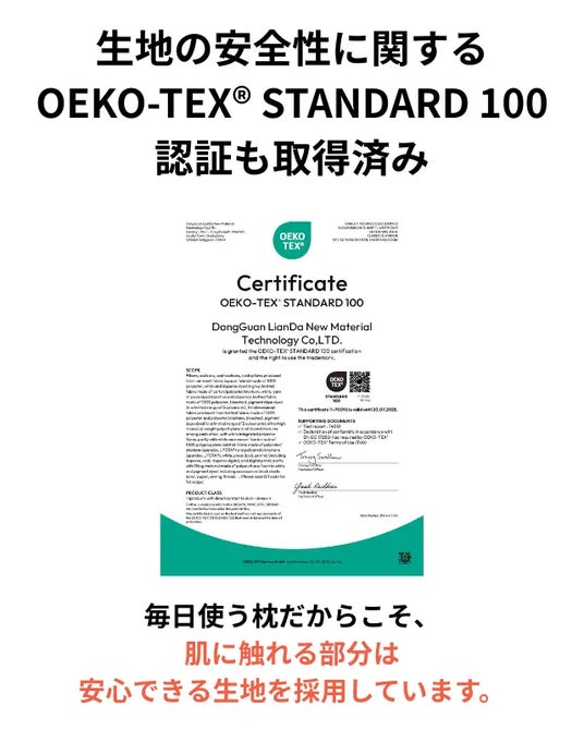 有害物質に関する世界基準をクリアした、肌にやさしい素材のため、毎日使う枕として安心してご使用いただけます。