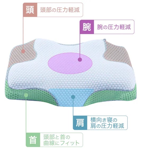 英国にて意匠登録済みの独自構造を採用し、頭・首・肩・腕を支える4点サポート設計により、自然な寝姿勢をサポートします。