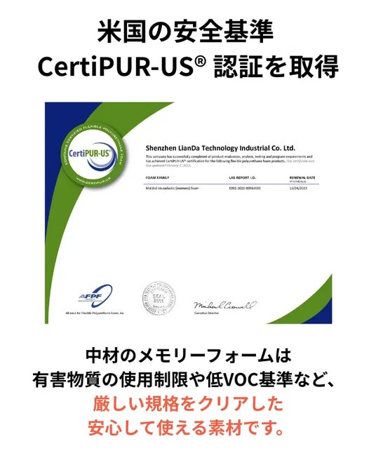 ZERO Pillowは、CertiPUR-US(R) 認証を取得した高密度メモリーフォームを使用しています。