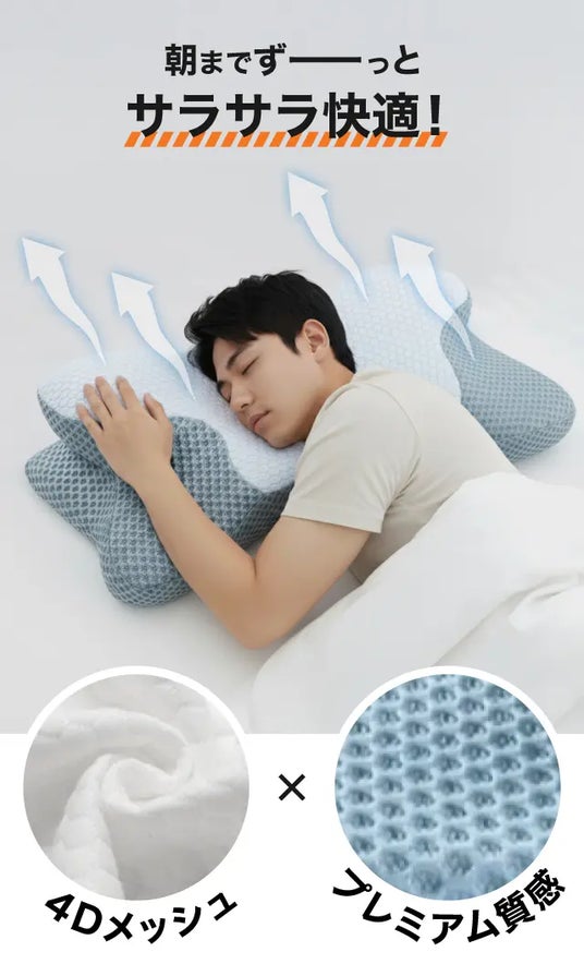 頭・首・肩・腕をそれぞれ独立して支える構造を採用し、寝返り時も頭部が安定しやすく、自然な寝姿勢をキープします。