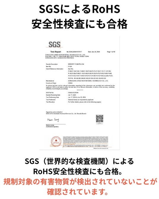 EUのRoHS指令(RoHS 2 / 3)に基づく検査をSGS(世界的な検査機関)が実施し、鉛・カドミウム・水銀・フタル酸など、規制対象物質はすべて基準値以下(不検出)です。