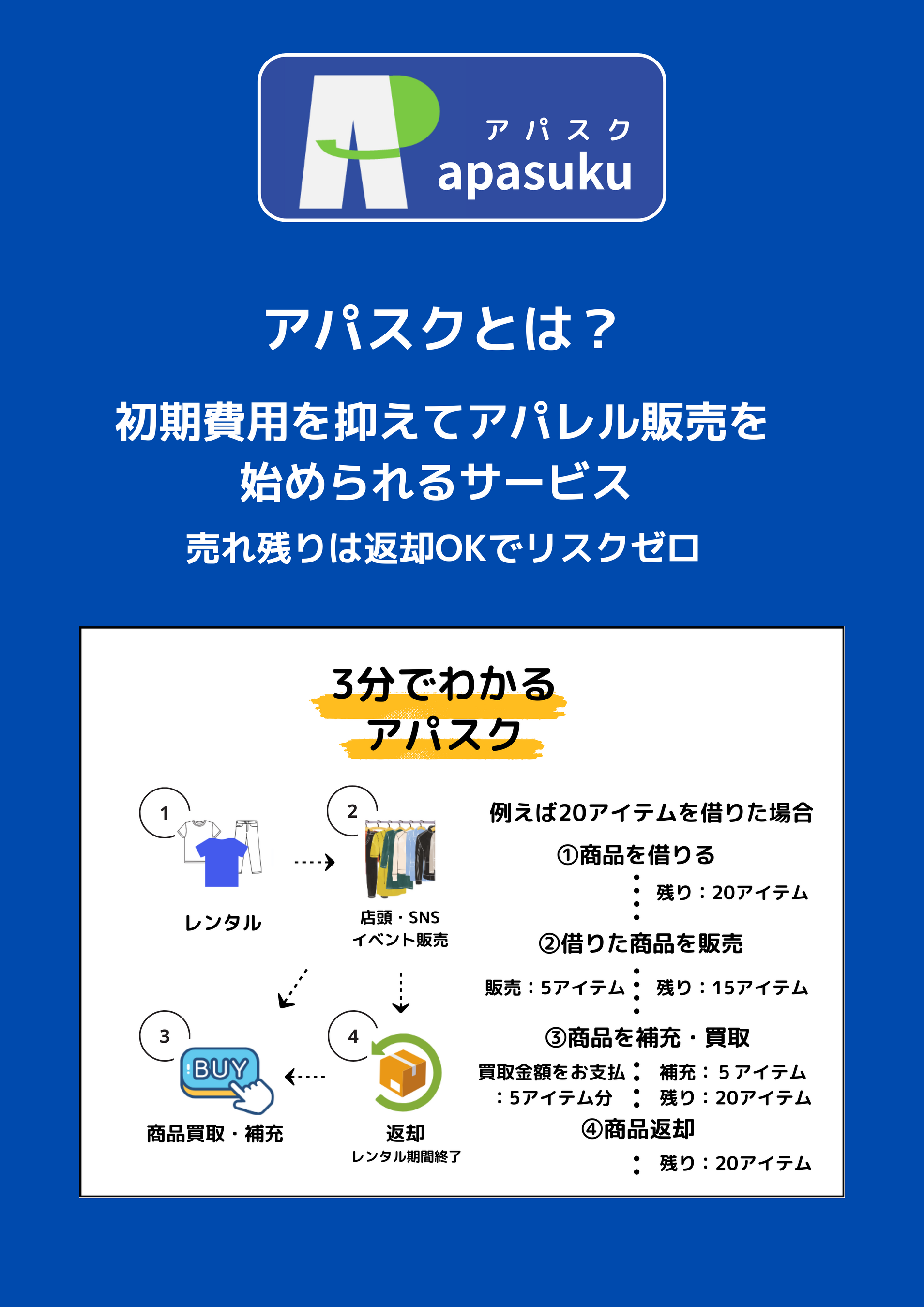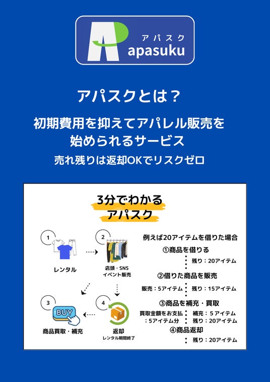 新サービス「アパスク・トライアルプラン」は、仕入れ不要でアパレル販売を始められる“販売可能レンタル”モデルを採用しています。