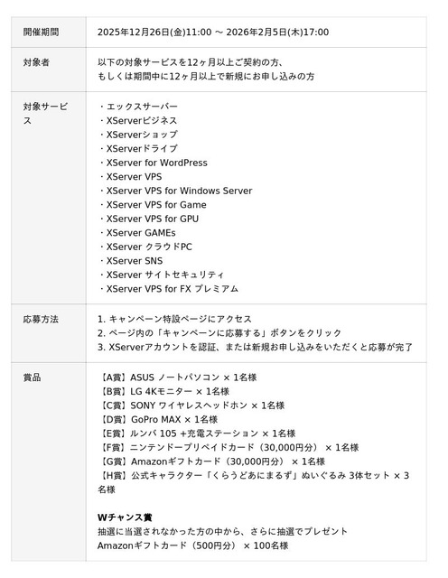 本キャンペーンは、国内シェアNo.1(※1)のレンタルサーバー『エックスサーバー』の他、同社が提供するサービスの契約者が対象です。