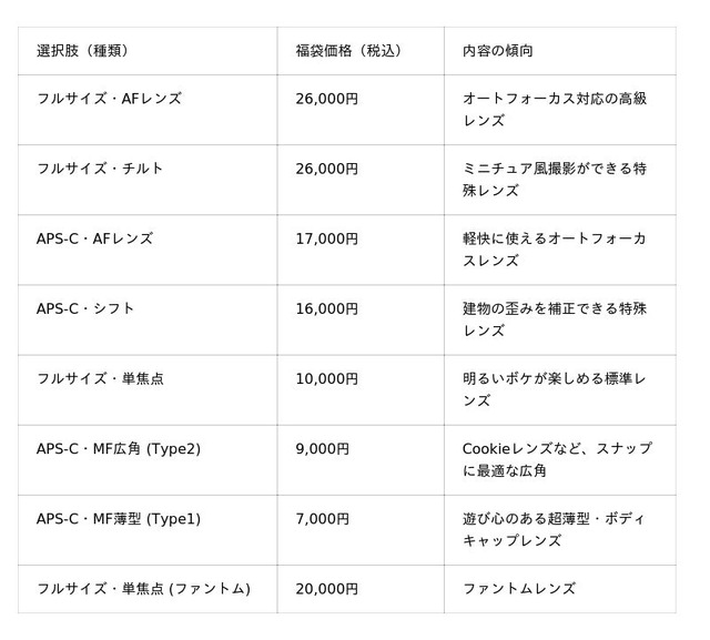 本福袋は、現行販売製品の大部分を対象としており、弊社が取り扱いのレンズ1本に加え、記念品(1点または複数点)をランダムで同梱いたします。