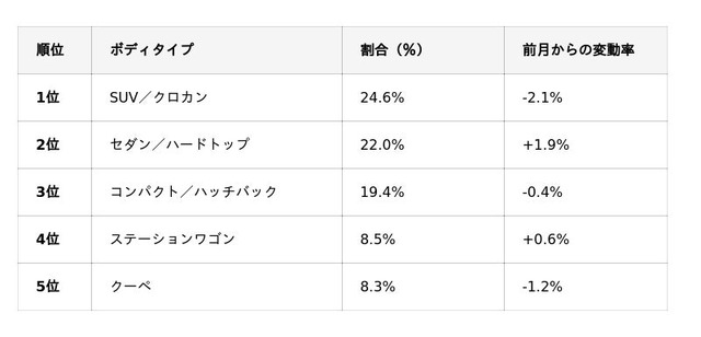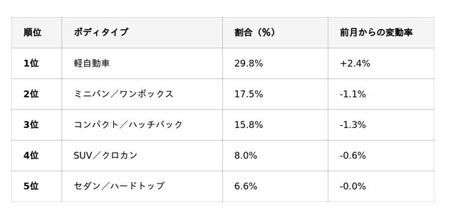 国産車ボディタイプ別買取ランキングは、1位の軽自動車から5位のセダン/ハードトップまで前月と同様でした。全体における各ボディタイプの割合は、軽自動車が若干伸びた以外は前月とほぼ変わらずに推移しています。