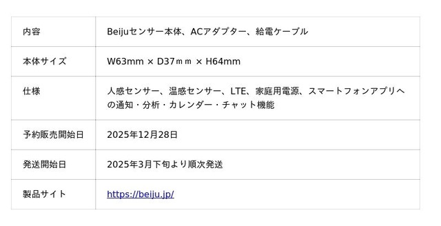 IoT×AI製品を開発・提供する株式会社モノ(新潟県新潟市中央区天神1-1-3プラーカ3B1F、代表取締役:熊谷悠哉、以下モノ)は、2025年12月28日(日)より高齢者見守りセンサー&アプリサービス「Beiju」を発表し、購入予約の受付を開始します。
