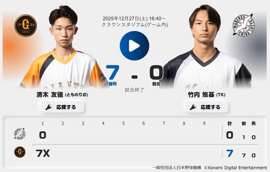 株式会社コナミデジタルエンタテインメントは、日本野球機構(NPB)公認のプロ野球eスポーツリーグ「プロスピA プロリーグ」2025シーズン supported by TIR GAMING(通称:スピリーグ)の最終戦「e日本シリーズ」を12月27日(土)にグランキューブ大阪で開催し、読売ジャイアンツが3勝0敗で千葉ロッテマリーンズを下し、初の日本一に輝いたことをお知らせします。