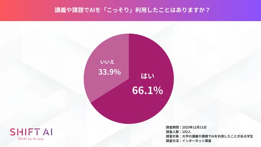 このように、大学で生成AIの活用が全面的、もしくは一部制限されている、あるいは授業ごとに対応が異なる環境に置かれている学生(n=192)に対し、「講義や課題で生成AIを『こっそり』利用したことがあるか」を尋ねたところ、「はい」と回答した割合は66.1%となりました。