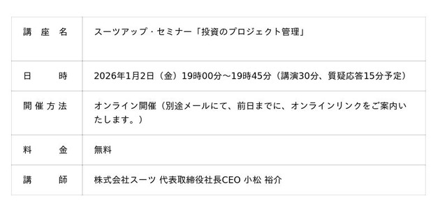 当社では、2026年1月2日(金)19時から、2026年最初となる当社代表の小松が講師を務めるスーツアップ・セミナー「投資のプロジェクト管理」を無料開催します。