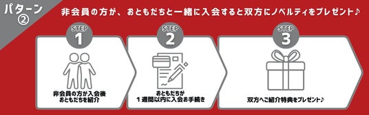 2026年1~3月中にスクールに在籍しているお子様がまだ通っていないお子様をご紹介して入会するか、まだスクールに通っていないお子様同士で1週間以内にご入会していただくと、特典をプレゼントいたします。