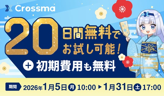 株式会社IZUMI(本社:東京都中央区京橋、代表:藤本卓治)が提供する「クロスマ」は、新規導入をご検討中の方を対象に、2025年1月5日(月)~1月31日(土)の期間限定で「新春キャンペーン」を開催いたします。