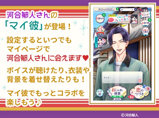 「幕天」のホーム画面(マイページ)に登場するカレ(マイ彼)に、コラボ記念イラストの河合さんが登場します。