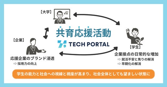 TECH PORTALは、そんな企業・社会が共に学生を育てていく「共育」のあり方へ転換するためのキャリア共創プラットフォームです。
