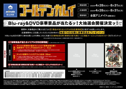 開催内容:対象商品をご購入1点ごとにもらえる〈1〉【景品が当たるシリアル付き応募用紙】よりご応募していただいた方の中から、抽選で45名様に豪華景品をプレゼントいたします。Blu-ray&DVD第13巻をお買い上げの際は、さらに先着で〈2〉【豪華金箔仕様!劇場先行版「札幌ビール工場編」キービジュアルB2ポスター】をプレゼントいたします。