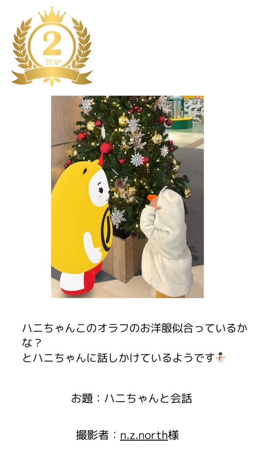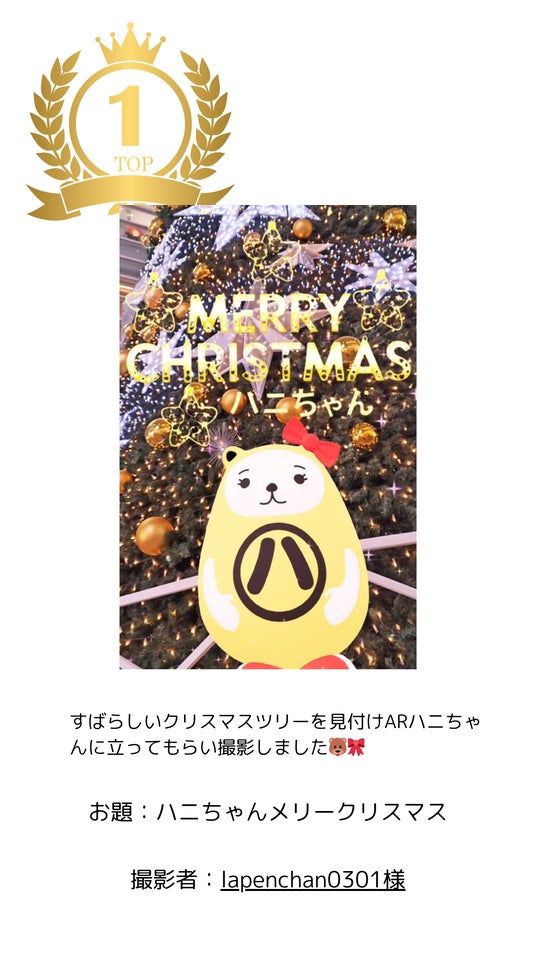 華やかなクリスマスツリーとARハニちゃんを組み合わせ、季節の高揚感とキャラクターの可愛らしさを最大限に引き出した一枚。イルミネーションの光と構図のバランスが美しく、「一緒にその場にいる」ような臨場感が高く評価されました。