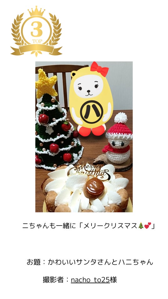 クリスマスの飾りやケーキとともにハニちゃんを配置し、“一緒にお祝いしている時間”を感じさせる温もりある表現が印象的でした。