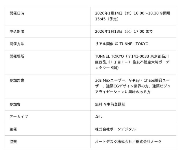 後半は、好評シリーズ「教えて公式先生!」をリアルイベントとして開催し、3ds MaxおよびChaos製品の実務的なTipsや活用事例をご紹介します。