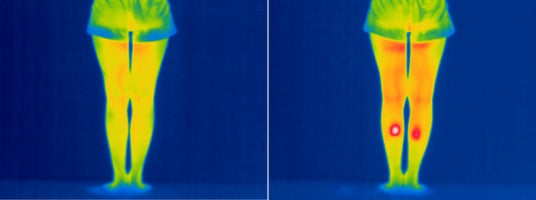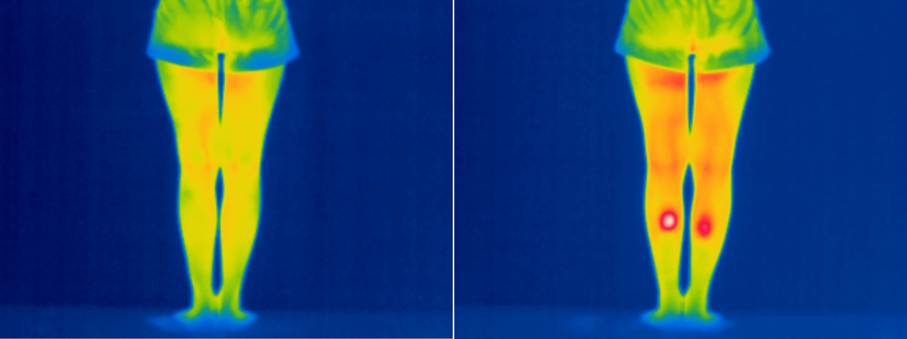 【試験概要】商品未使用時(左)とエアフットをふくらはぎに着用して使用した後(右、衣服を着用した上でストレッチモード+温熱にて10分間使用)とを比較。温度スケールは20-39℃。N=1、30代女性。社内調べ。