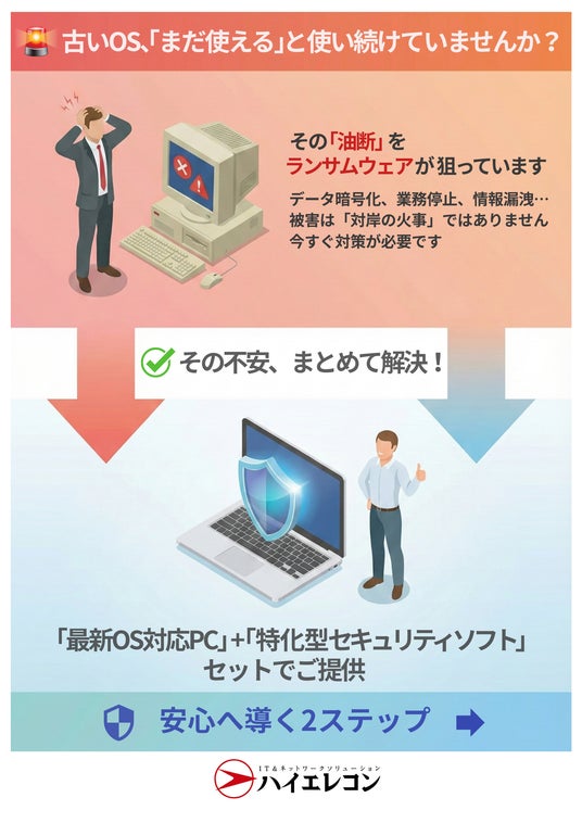 IT&ネットワークソリューションを提供するハイエレコン(Hi-Elecom)は、巧妙化するサイバー攻撃から企業の重要資産を守るため、「最新OS対応PC」と「特化型セキュリティソフト」を組み合わせたセット導入支援の提案を強化します。