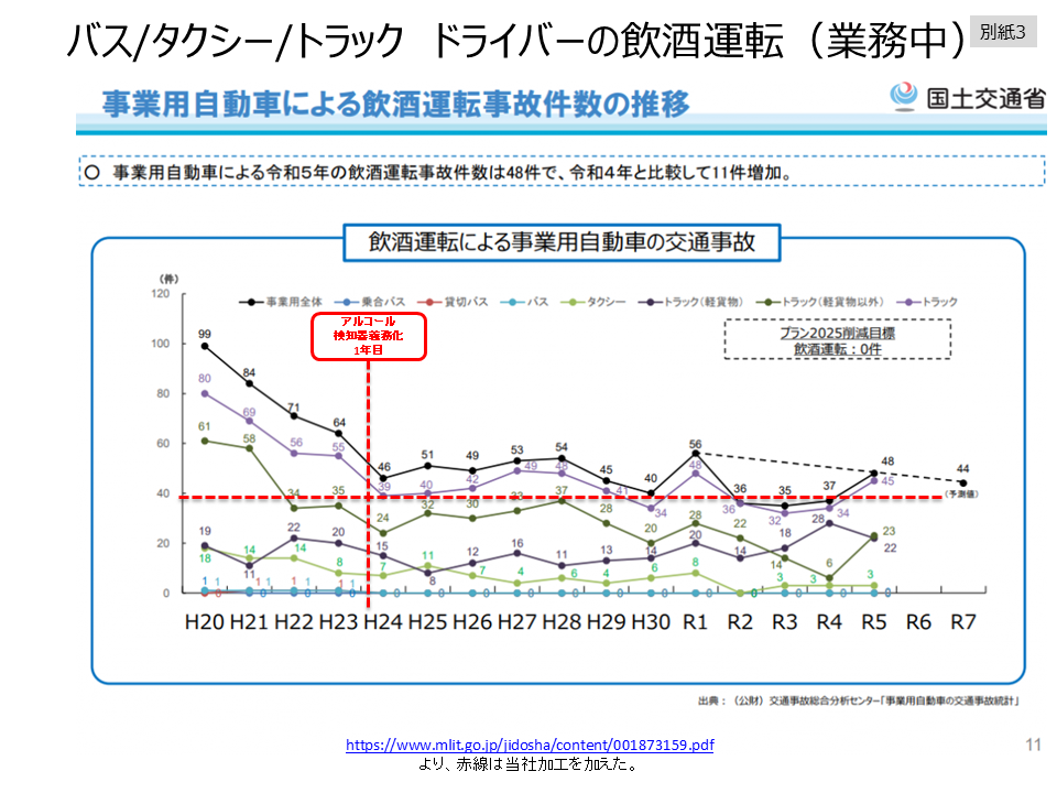 当社は、年間2万人いる飲酒運転者へのアルコール・インターロック装着は、法制化されるべきと考えています。また、プロドライバーの飲酒運転ゼロの実現なくして、年間2万件以上もある日本の一般ドライバーによる飲酒運転ゼロ実現は不可能であるとも考えています。運輸行政は、決して、悪意ある市井の飲酒運転者に、「プロドライバーでさえ飲酒運転している」と言わせない政策を実現すべきである。