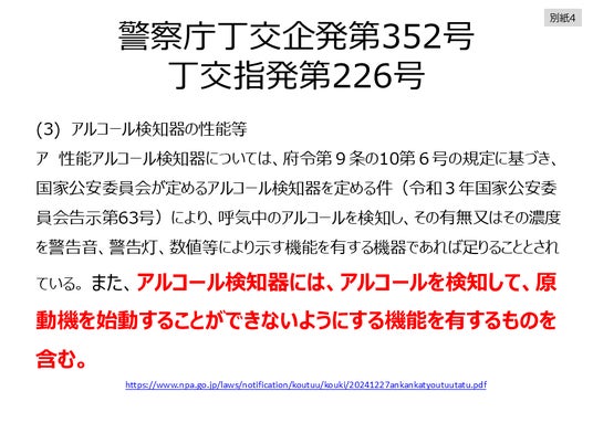 2021年6月28日、千葉県で、悲痛な飲酒運転死亡事故が起きました。加害側が「白ナンバートラック」であったことから、警察庁・公安委員会は、再発防止のため、安全運転管理者選任事業所に対し、アルコール検知器使用を義務付ける道交法施行規則の改正を行い、このなかで、アルコール・インターロック等、車載タイプも、アルコール検知器の一種であるとされました。(別紙4)