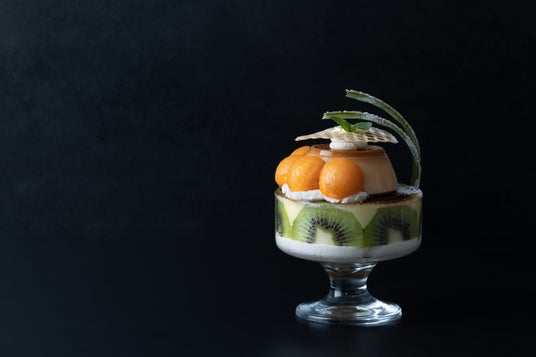 香ばしくキャラメリゼしたブリュレの上には、もっちり食感のメロンプリンとみずみずしいメロン果肉を重ね、ビスコッティやラングドシャの食感をアクセントにしました。さらにキウイと濃厚なメロンチーズクリーム、メロンの生ジュレとピューレを合わせた、ひと口ごとに表情を変える季節限定のメロンパフェです。