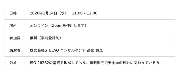 ソフトウェア領域へのエンジニアリングサービスを提供する株式会社STELAQ(本社:東京都渋谷区、代表取締役社長:山本 美希子)は、無料オンラインウェビナー「ISO/PAS 8800(自動車-安全性及び人工知能)概要セミナー」を2026年1月14日(水)11:00~12:00に開催します。